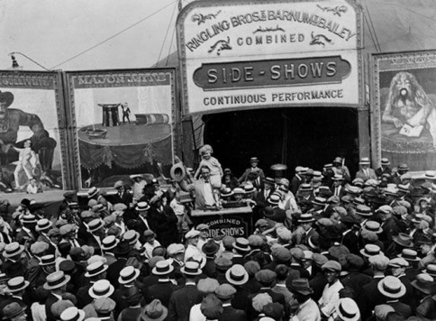 Cirkus je bio postavljen na velikom prostoru koji se sastojao od šatora i štandova iza kojih su se nalazile prikolice koje posjetiteljima nisu bile vidljive. U prikolicama su živjele osobe koje su nastupale u cirkusu. Njihovi su plakati bili povješani svuda okolo. Crno-bijeli – tiskanih slova koje su ispisivali naslove – Pripitomljeni Čovjek Lav, Žena bez udova –pali cigaretu ustima; Žena prekrivena tetovažama, Najdeblja žena na svijetu!; Žena s četiri noge, Alsoria - djevojka kornjača; Lepo - leopard dječak; Spike Howard – najjači čovjek na svijetu, koji zubima vuče kamion; Mortado - ljudska fontana iz Njemačke; Chemerea - ljudski balon; Antonio Gallindo - Kubanac koji puše dim kroz uši.